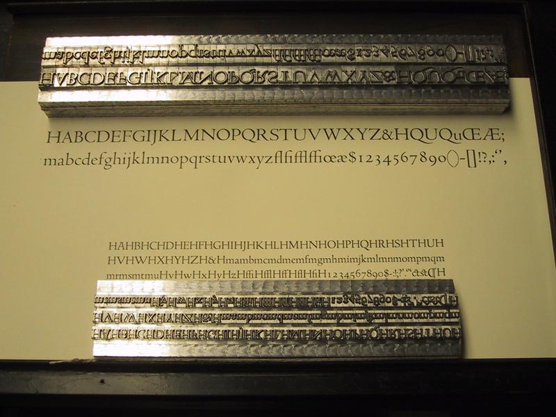 On the bottom left is a case and sample mat of American-type Thompson mats, these ones for 36 point Goudy Light Italic (Frederic Goudy). On the right is a case and sample mat of English-type Thompson mats, those for 36 point Centaur (Bruce Rogers). Sitting above the "E" is a mat holder, which is loaded into the caster and allows the casterman to properly align the mat on the body. | |