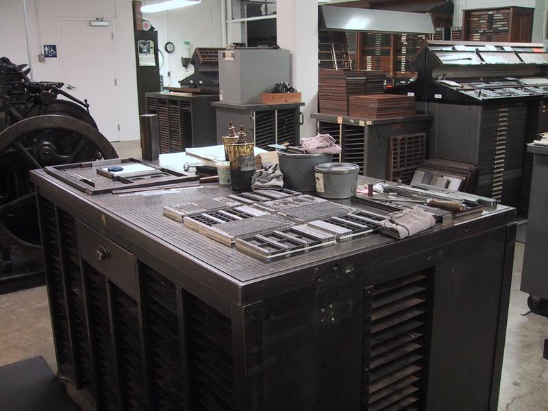 Our main imposing stone. Before type is loaded in the press, it is made up on this stone, planed, and locked up in chases (steel frames, one is on the far end of the stone). Some stones are made from marble. This one is milled steel. | |